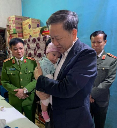 Đại tướng Tô Lâm, Bộ trưởng Bộ Công an bế cháu bé, con gái 6 tháng tuổi của Trung úy Phạm Công Huy