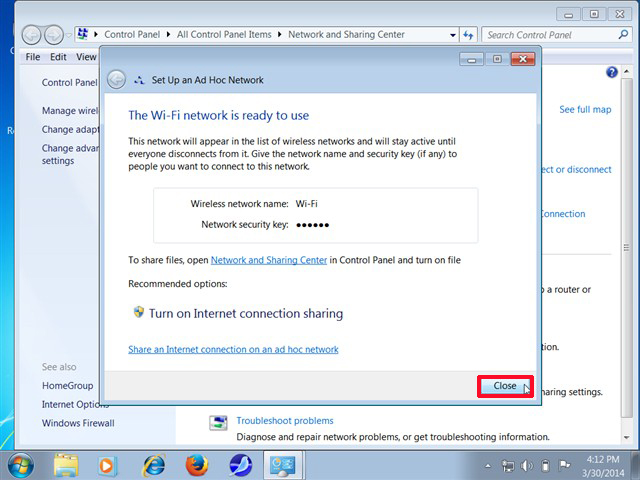 Sau khi quá trình chia sẻ mạng Wi-Fi đã hoàn tất, các bạn có thể kích hoạt thêm tính năng chia sẻ tập tin bằng cách nhấn chọn “Turn on Internet connection sharing”, nhấn Close để tắt cửa sổ này đi.