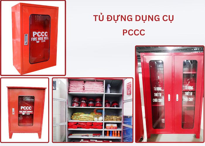 Tủ đựng dụng cụ PCCC thường chứa các thiết bị như bình chữa cháy, cuộn vòi chữa cháy, bộ áo phòng cháy, kính chắn khói, búa thoát hiểm, áo phao cứu sinh, thiết bị cứu hộ, và nhiều công cụ khác. Thiết kế và kích thước của tủ PCCC có thể thay đổi tùy theo mục đích sử dụng và nhu cầu cụ thể của từng cơ sở hoặc khu vực.